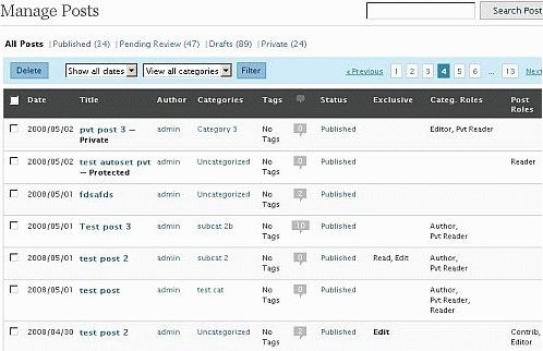 - New columns in the Manage Posts and Manage Pages interface indicate Exclusive settings (i.e. user blog role ignored), Category Roles, Post/Page Roles for each post.